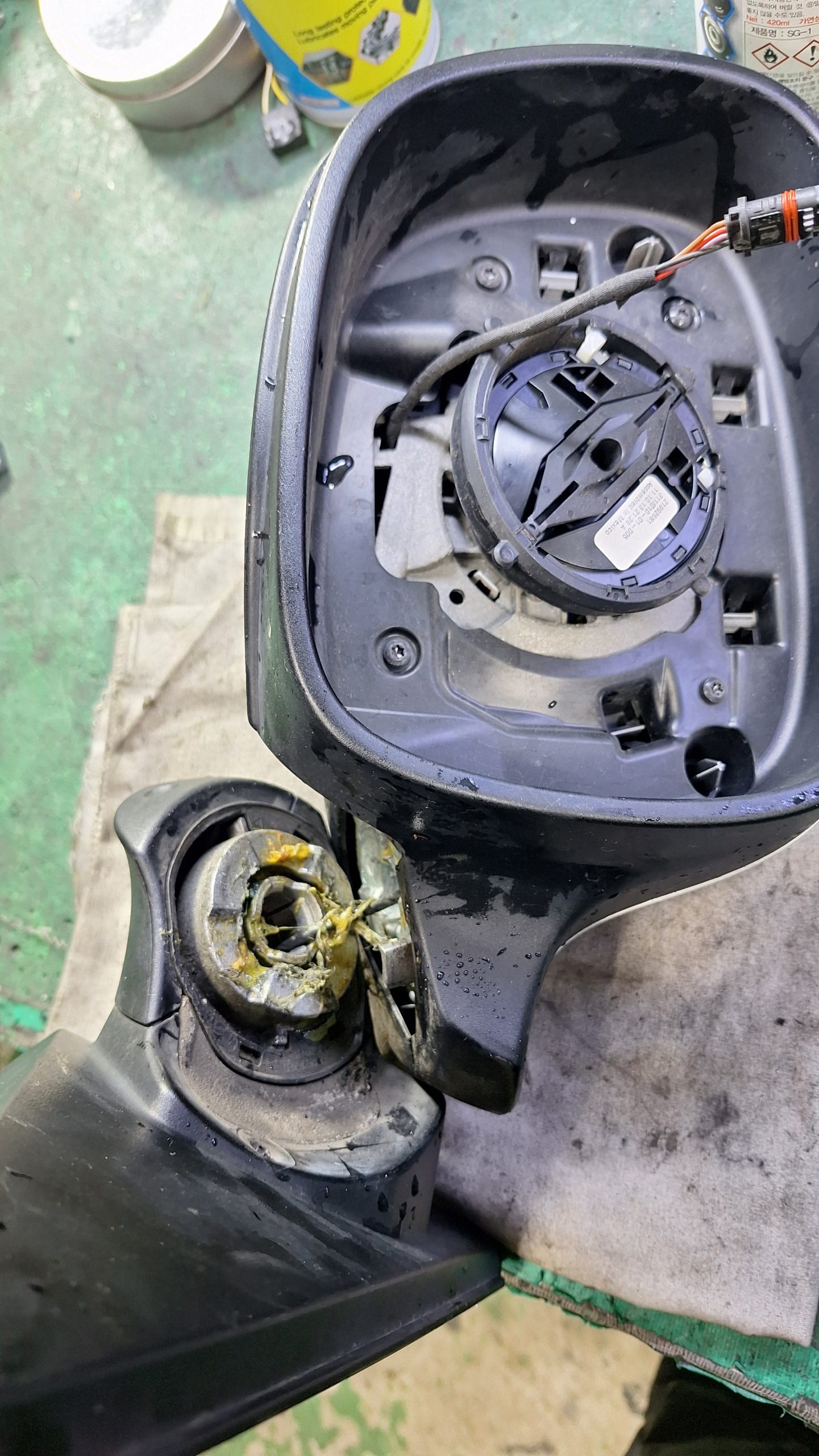 2022/04/21,22일 양일에 걸쳐 BMW SUV(X3 ) LH 사이드미러 목부러짐의 파손으로 인근 거래처에서 고장수리 의뢰하여 작업한 것입니다. BMW SUV차량,X1,X3의 사이드미러(백미러)목부러짐은 흔한 사고유형입니다. 사이드 미러의 접히고 펼침의 축이 알루미늄 합금으로 되어있어 가벼운 충격에도 쉽게 부러짐으로 보다 큰 사고를 줄이기 위한 재질선택인듯합니다. 저희 업체는 수입차 사이드미러 전문수리업체입니다. 저희 업체는 전국 각지의 자동차 수리업체,카센터, 중고상 딜러등 백미러를 수리업체로부터 작업의뢰경우 수리하는 중간업체를 주로 상대하는 업체입니다.
